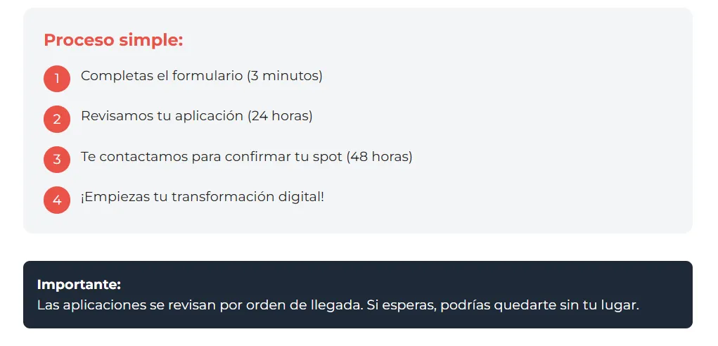 Esta no es una invitación masiva. Es una oportunidad exclusiva para emprendedoras comprometidas que, como tú, buscan hacer crecer su negocio sin complicaciones técnicas ni presupuestos millonarios.